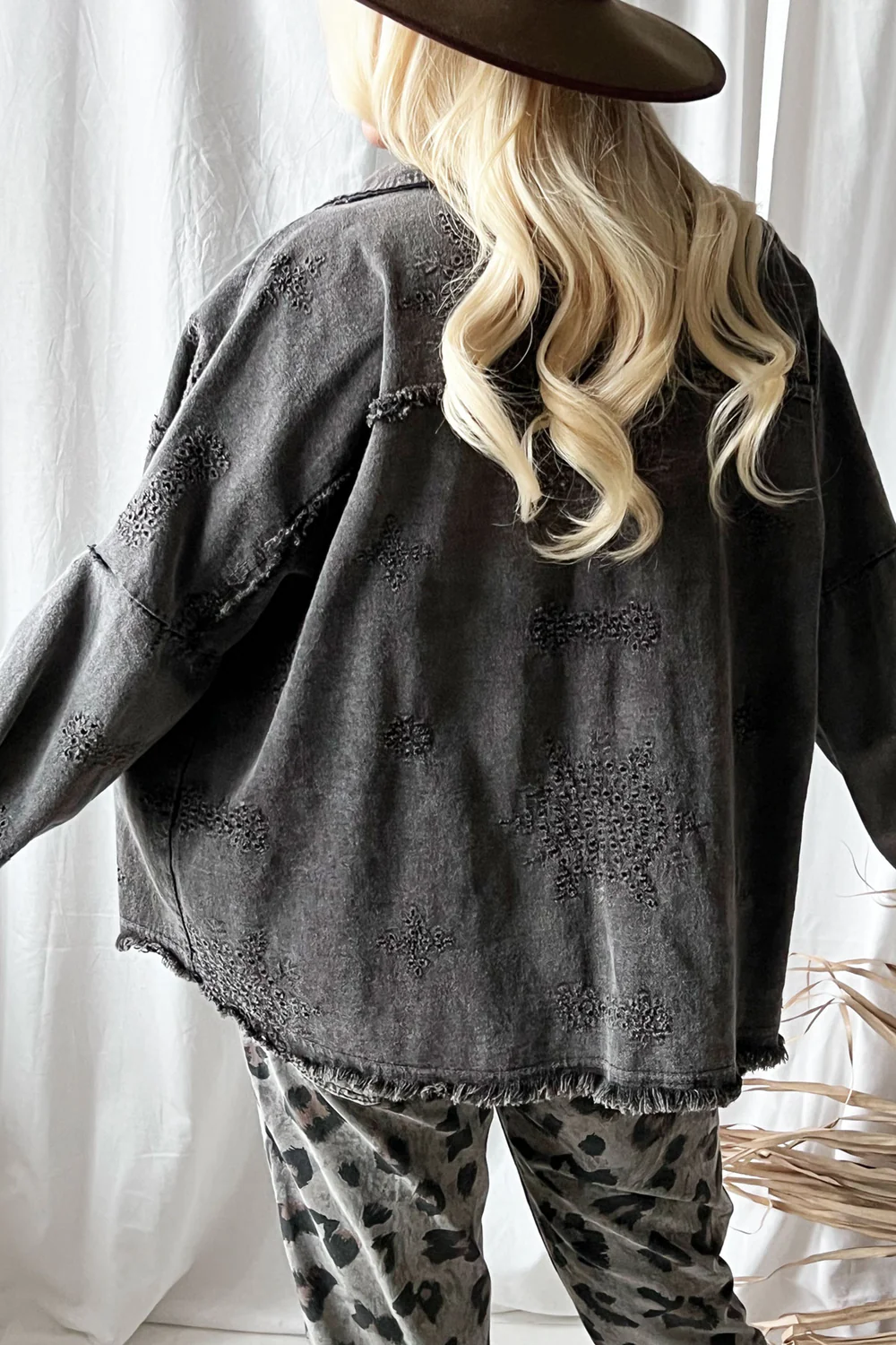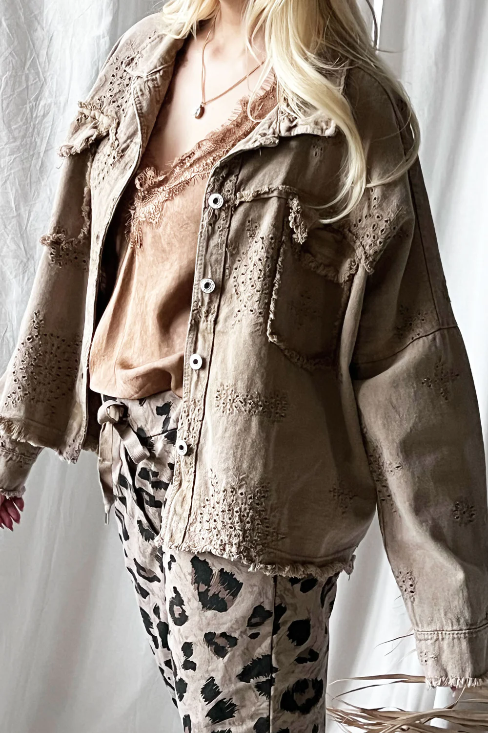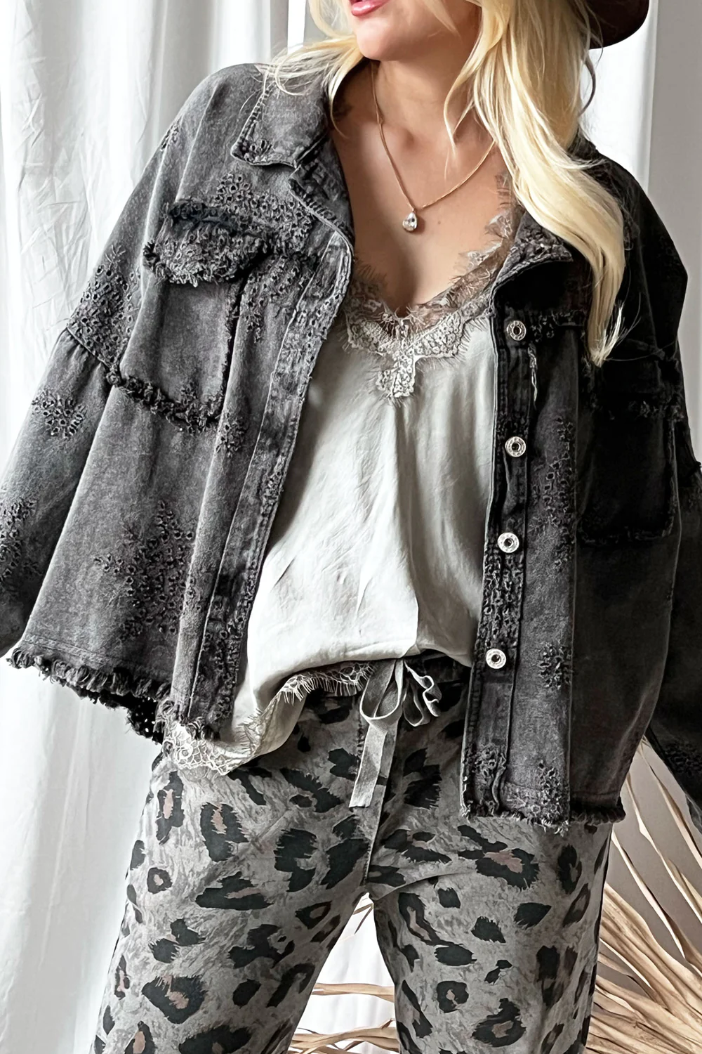 Lässige und leichte Jacke mit Vintage-Waschung. Brusttaschen und Saum mit Fransen.