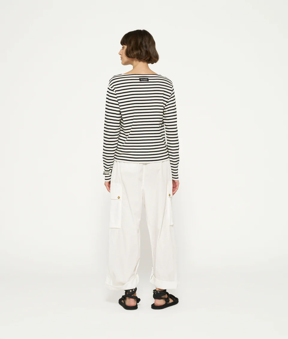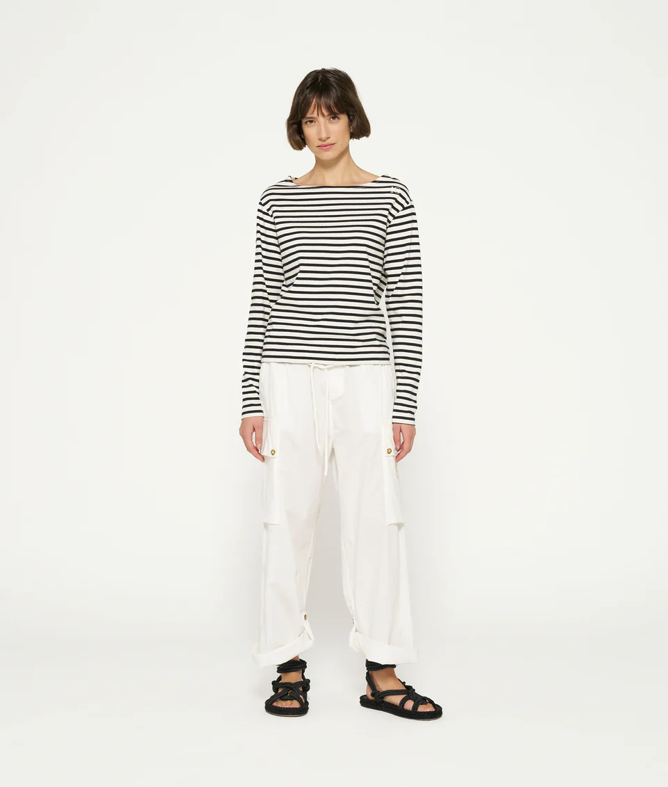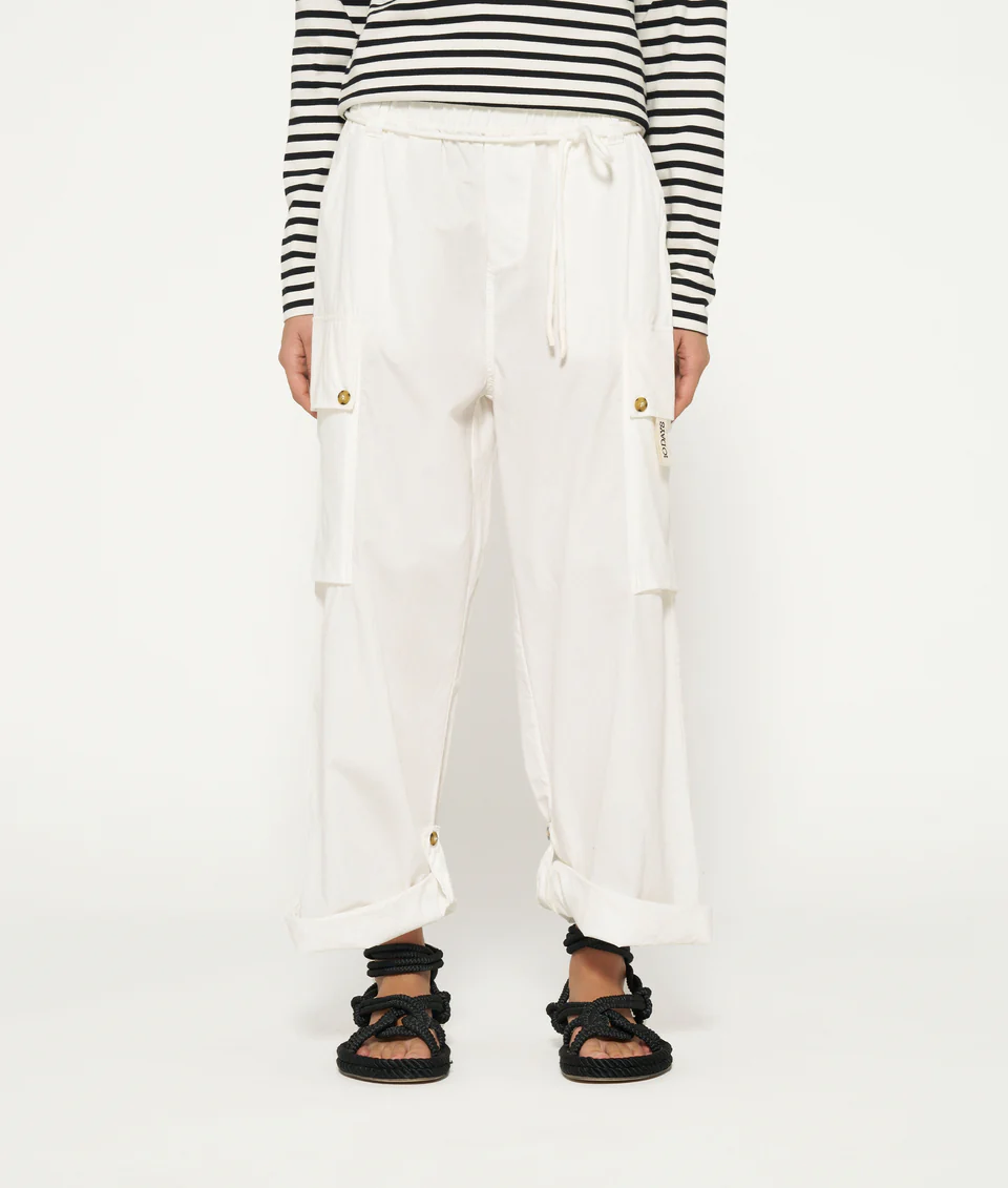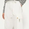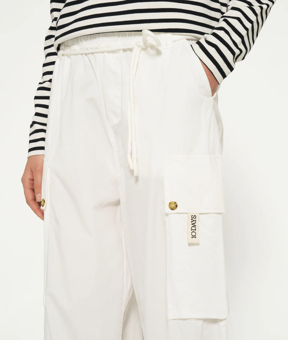 Relaxed Fit Utility-Hose mit weitem Bein, gefertigt aus einem Twill-Baumwoll-Mix. Die Hosenbeine lassen sich auf 3 Arten stylen: in voller Länge, hochgekrempelt und mit Druckknopfverschluss. Die luftige Hose hat einen elastischen Taillenbund mit Gürtelschlaufen und einer Jersey-Kordel, aufgesetzte Seitentaschen, schräge Eingrifftaschen, eine Pattentasche und eine angedeutete Gesäßtasche sowie ein Label an der linken Seitentasche.