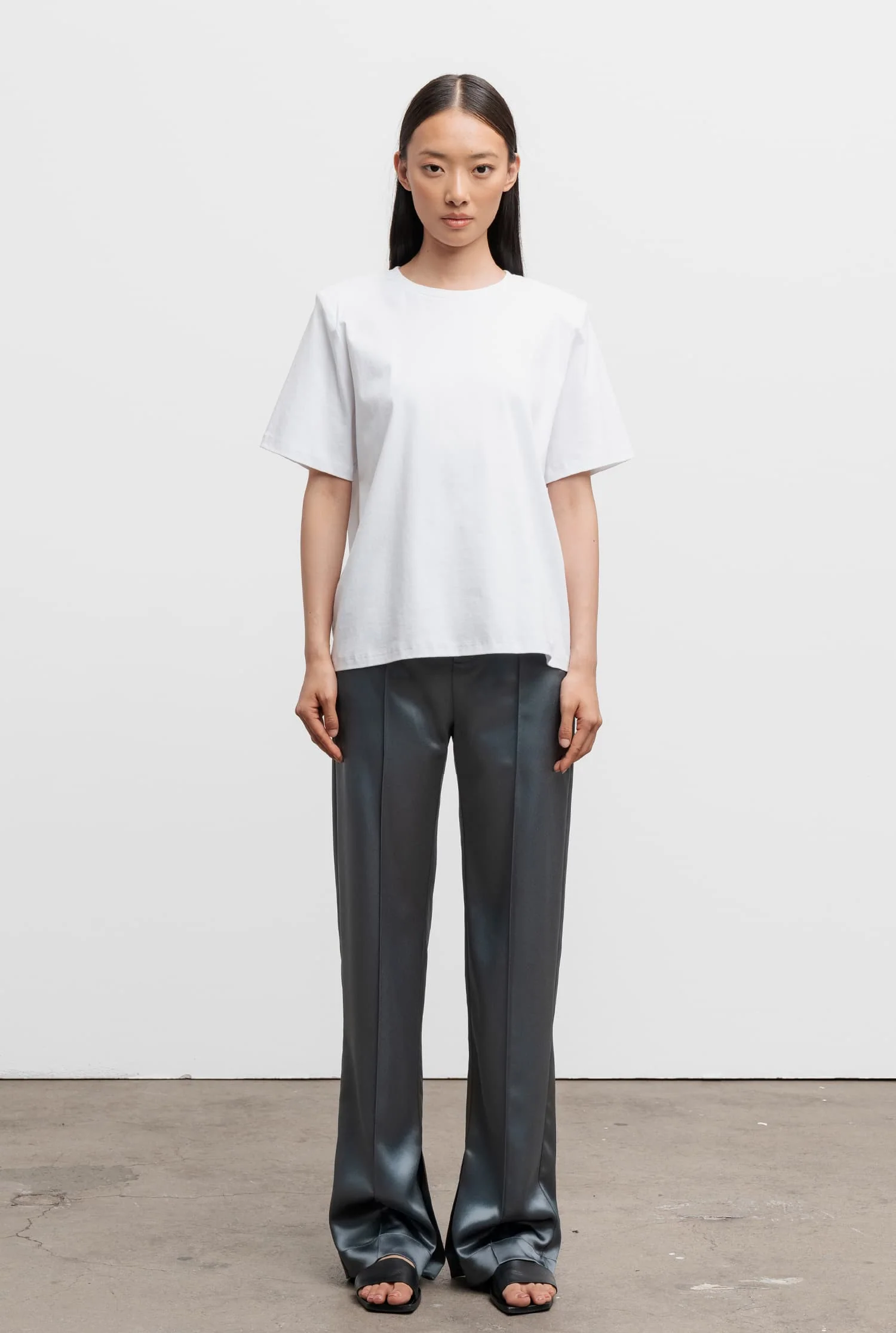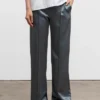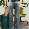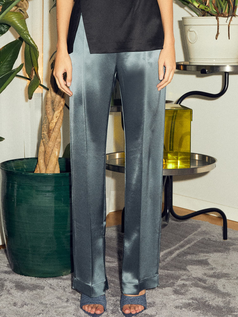 Die Arya-Hose ist aus einem elastischen Acetat-Mix mit einer halbglänzenden Oberfläche geschnitten, die hoch in der Taille sitzt, zusammen mit einem geraden und leicht schmalen Bein. Sie verfügt über Taschen in der Seitennaht, einen Hosenschlitz und eine vertikale Naht entlang des vorderen Beins.