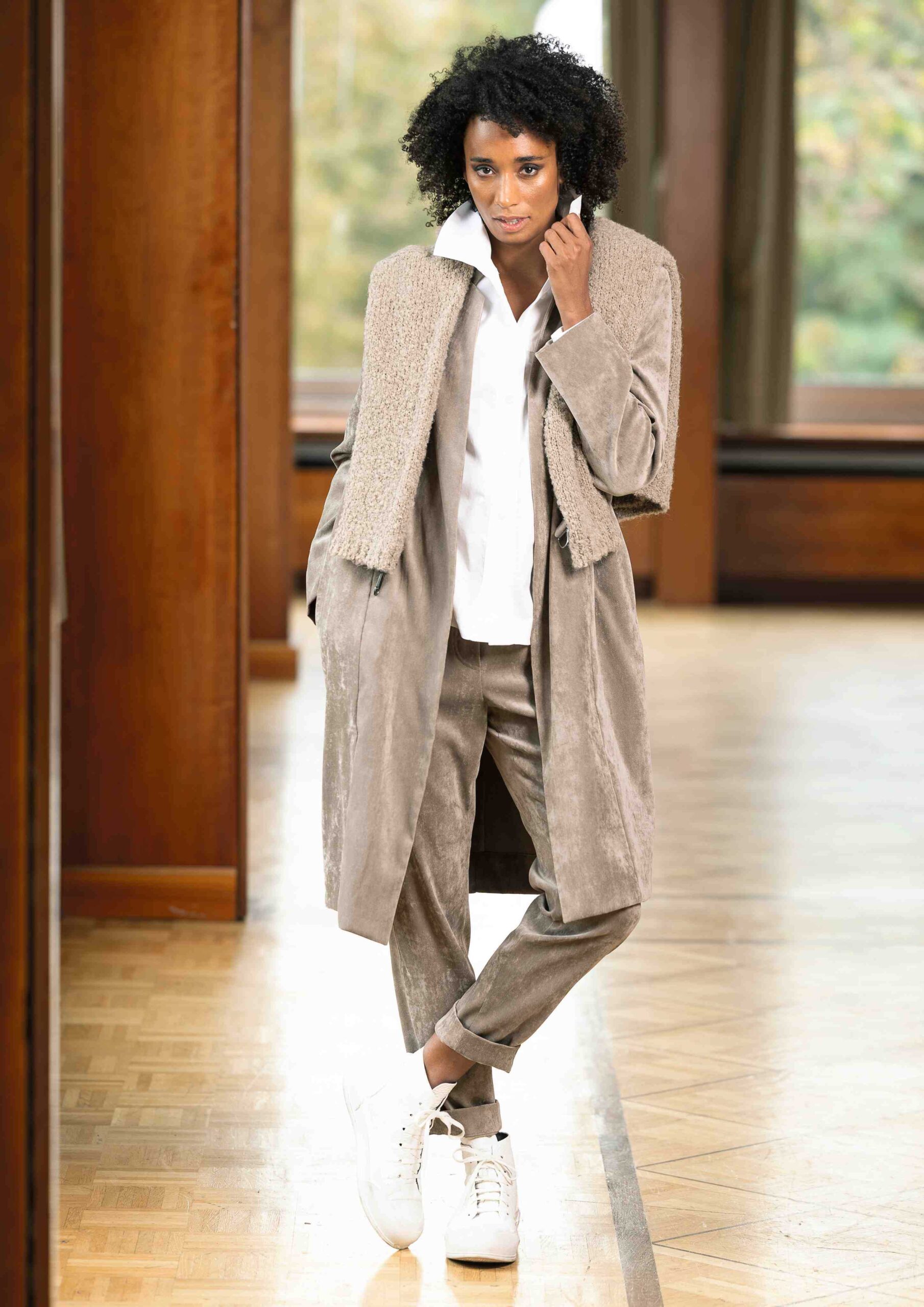Hier ein ausgefallener Mantel in ganz feiner Samtoptik, den FRAU sowohl sportlich als auch sehr schick tragen kann.