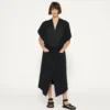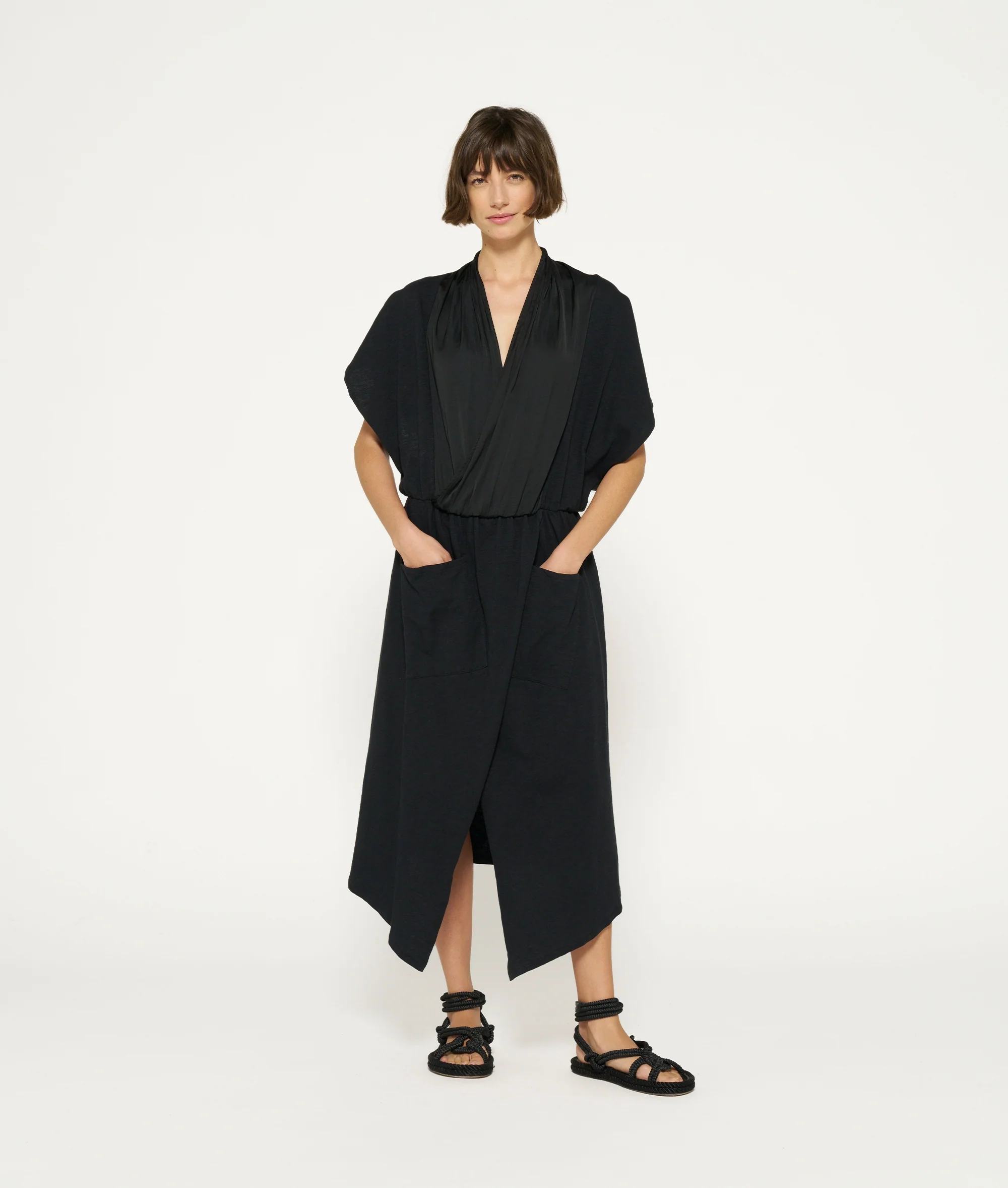 Kimono-Wickelkleid in Relaxed Fit, aus Baumwoll-Slub-Jersey gefertigt. Mit einem Satinkragen, zwei auf der Vorderseite aufgesetzten Taschen, kurzen, schrägen Ärmeln, einem elastischen Taillenbund, einem rückseitig, unterhalb der Nackenlinie applizierten Label und einem auf der Vorderseite ausgeführten Schlitz.