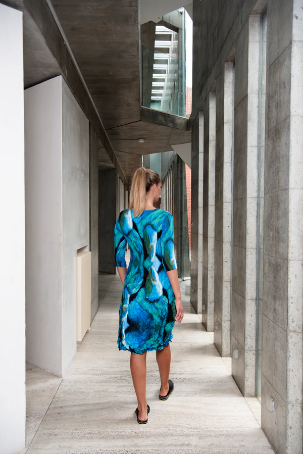Das Smash Pocket Plissee Kleid mit 3/4 Arm von Alquema ist ein tragbares Kunstwerk, das sich dem individuellen Körper anpasst. Dank der dreidimensionalen Struktur des Gewebes legt sich das Kleid sehr schmeichelhaft um den Körper, ohne abzuzeichnen. Das Kleid besteht aus Satin, dessen matte Seite außen liegt. Das Smash Pocket Kleid ist knielang, hat ¾ lange Arme, einen Rundhalsausschnitt und zwei aufgesetzte Taschen auf der Vorderseite. Die Plissees verlaufen im Bereich des Oberkörpers vertikal und im Bereich des ausgestellten Rocks in alle Richtungen. Die handgearbeiteten Plisseefalten verleihen den Kleidern des australischen Modelabels Alquema ihre unverwechselbare Silhouette. Die Kleider sind aufgrund der Plissees in der Größe sehr flexibel.
