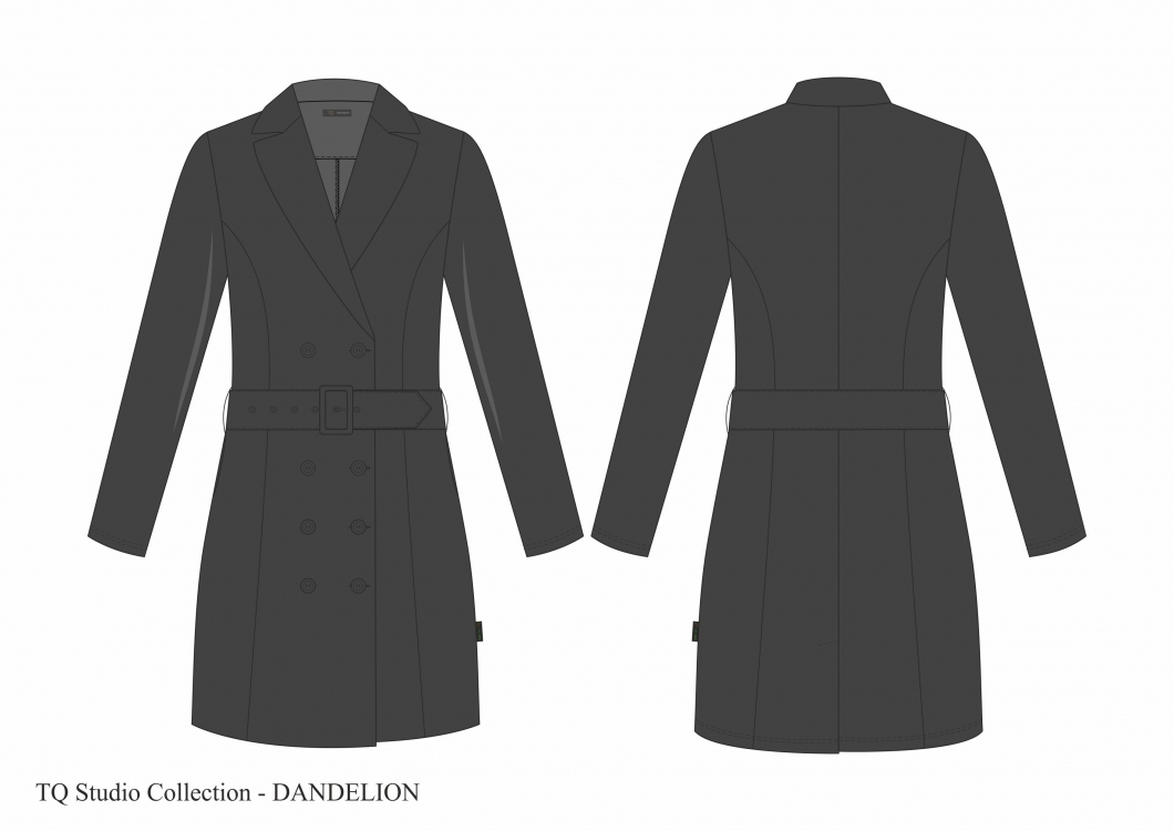 Dieses zweireihige Blazerkleid aus Reisestoff aus der TQ Studio Collection, das auch als Jacke getragen werden kann, hat eine doppelte Reihe schöner großer Knöpfe und einen breiten Gürtel.