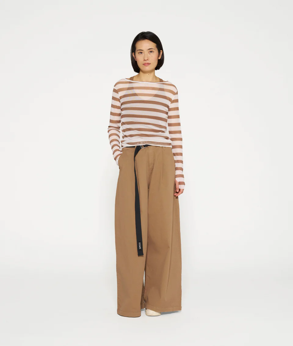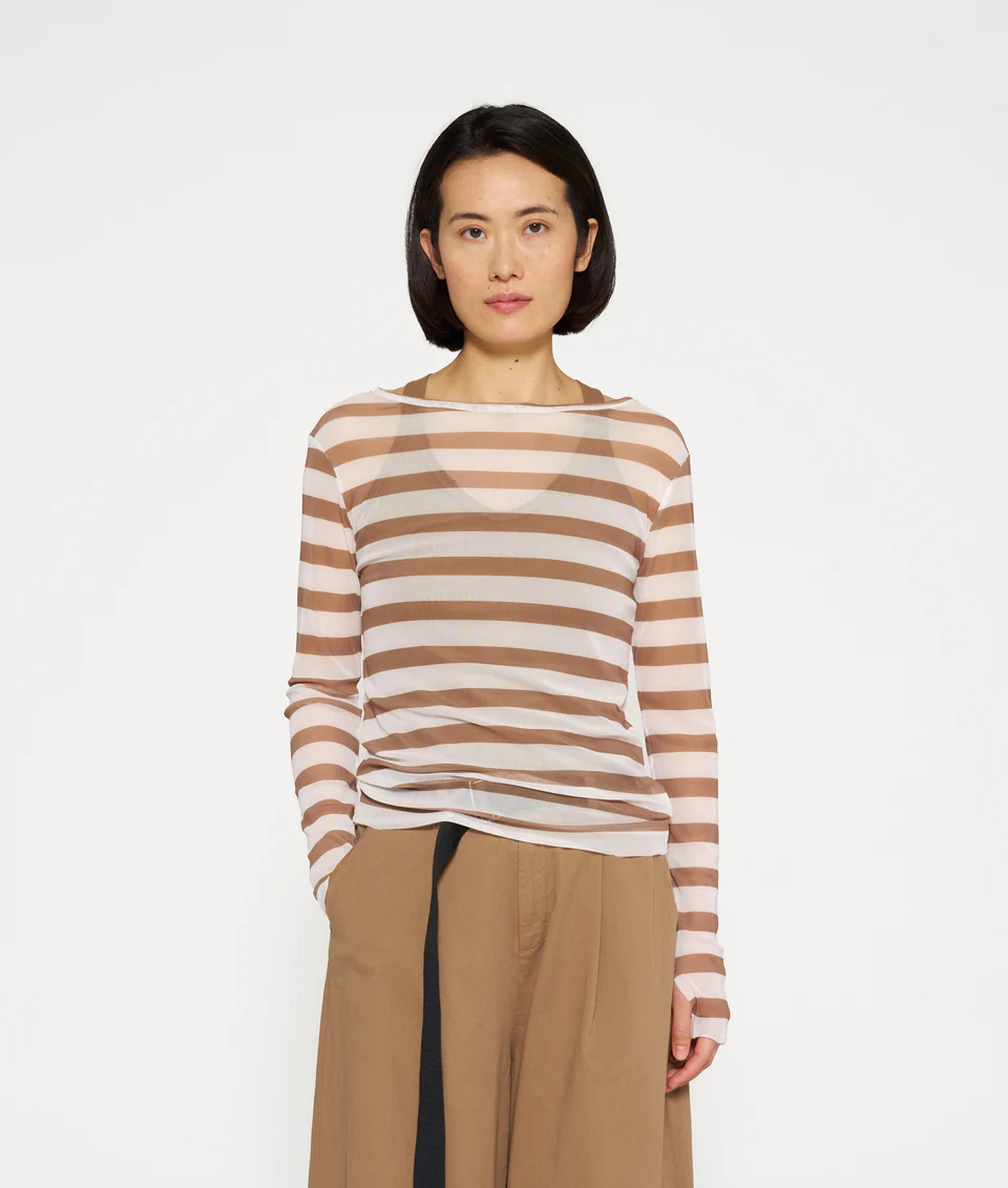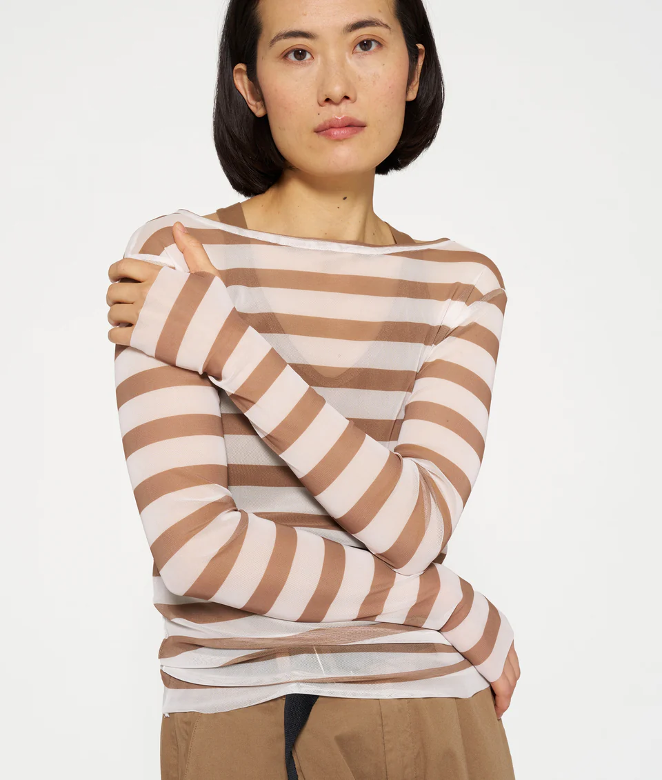 Transparentes Longsleeve Top mit Slim Fit mit breitem Streifendesign, aus Mesh gefertigt. Mit einem breiten U-Boot-Ausschnitt, langen Ärmeln mit Daumenlöchern, Raw-Edge-Finish an Saum und Ärmelabschlüssen und einem auf dem Rücken applizierten „10”-Logo.