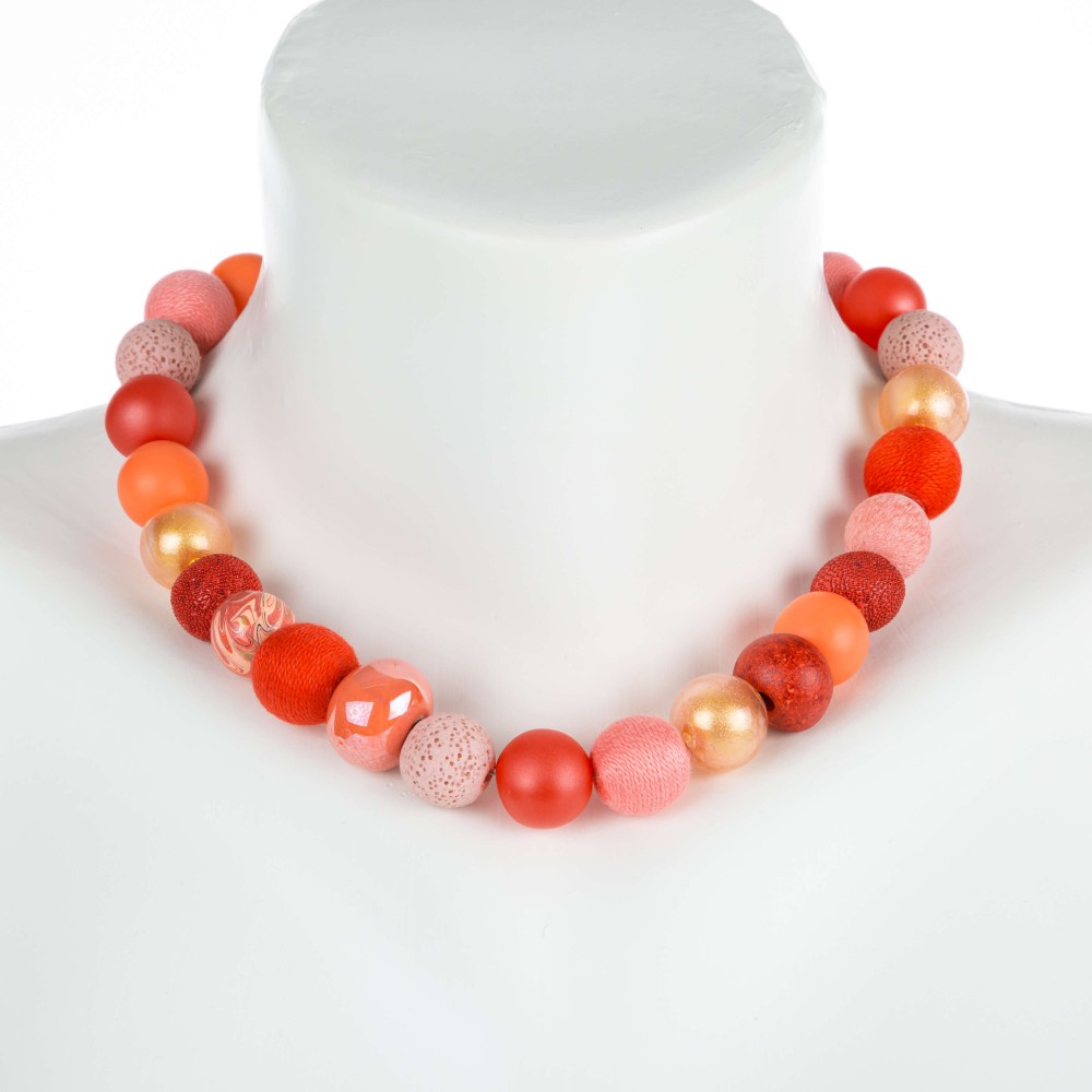 Die Kette aus edlem Materialmix ist eine noble Kombination aus verschiedenen Rottönen. Die Vielfalt der Perlen ist zudem ein echtes Highlight.
