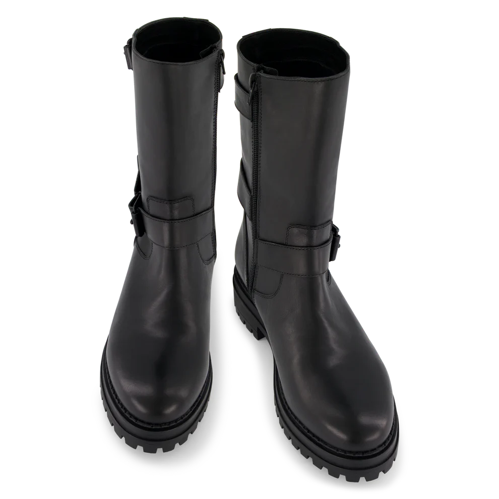 Coole zeitlose Bikerstiefel mit Reißverschluss und Schnallen, aus Nappa. Sie können diese Stiefel zu Jeans, Shorts oder einem Kleid kombinieren. Wir sind Fans dieses Stiefels, oder?