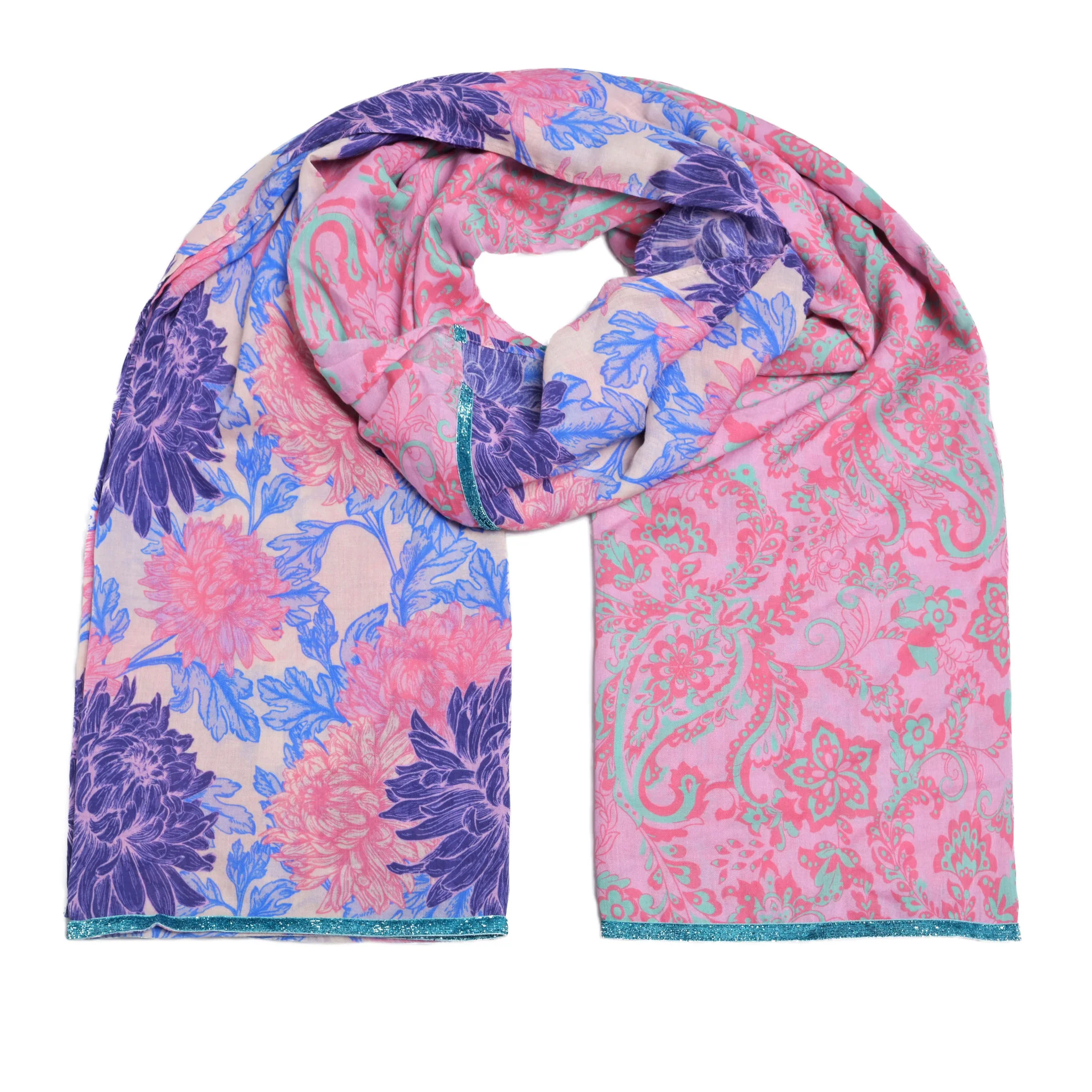 Der Schal aus reiner Baumwolle, hat auf der einen Seite ein wunderschönes Blumen-Motiv und ist auf der anderen Seite mit einem Paisley Muster verziert.