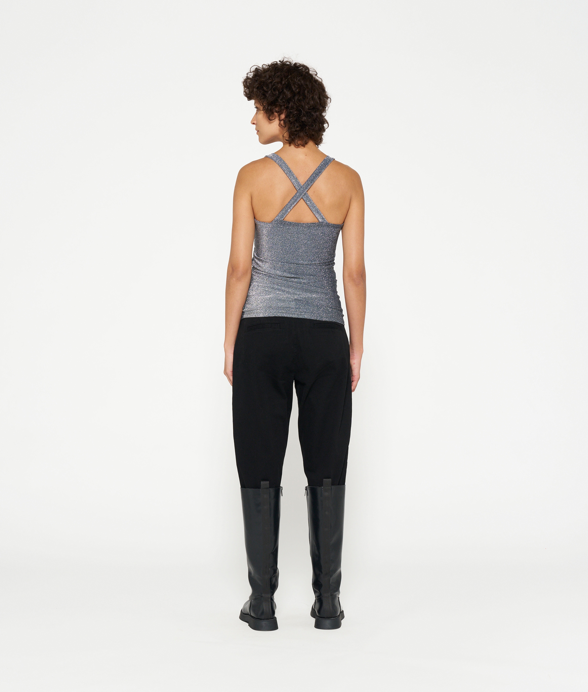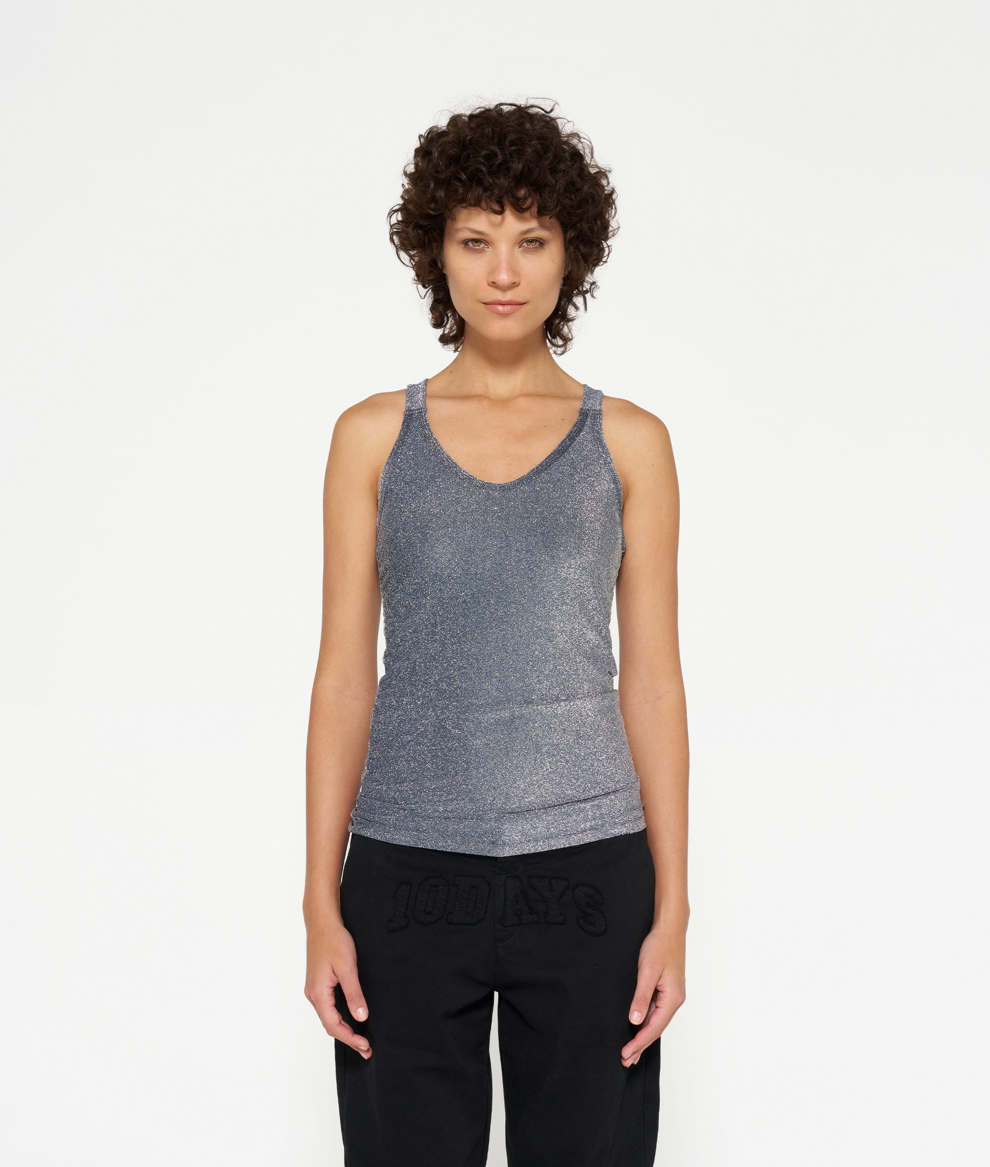Slim Fit Singlet Top mit Glitter und rückseitig gekreuzten Trägern aus bequemem Elathan-Mix. Das Top hat ein Vintage-Finish am Ausschnitt und ein Medal-Label an der linken Seitennaht.