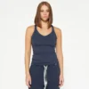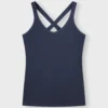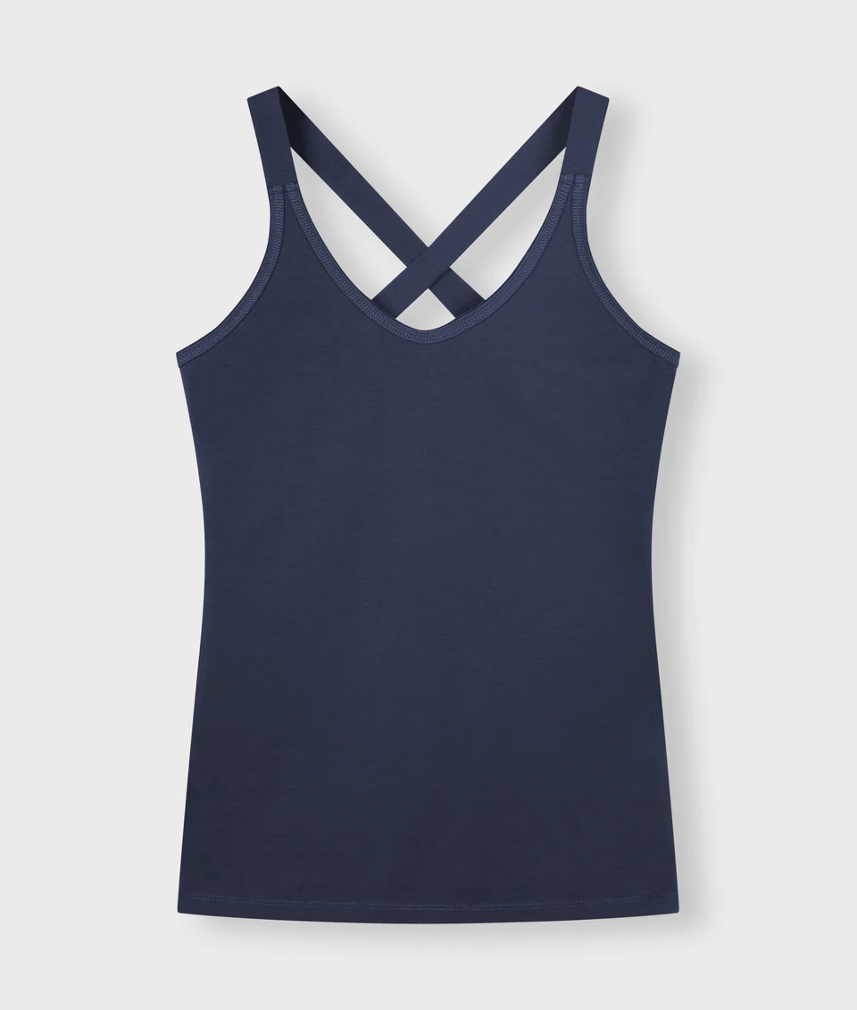 Slim Fit Singlet Top mit im Rücken gekreuzten Trägern, aus Bio-Baumwoll-Jersey gefertigt. Mit Vintage-Finish am Halsausschnitt und einem Mini-Stripes-Logo am Rücken. Toll unter dem dunkelblauen Pulli …